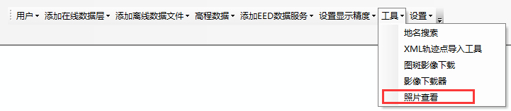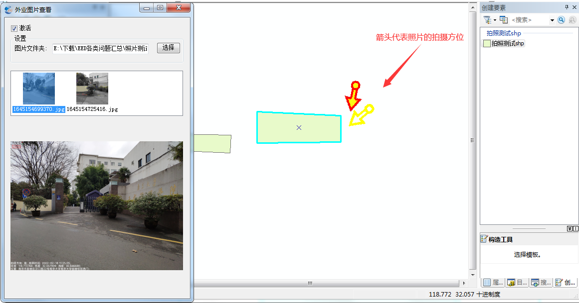 2、在加载shp要素和编辑好字段后,打开EED影像插件的“工具栏”点击“照片查看”,会弹出专门的“图片查看对话框”。