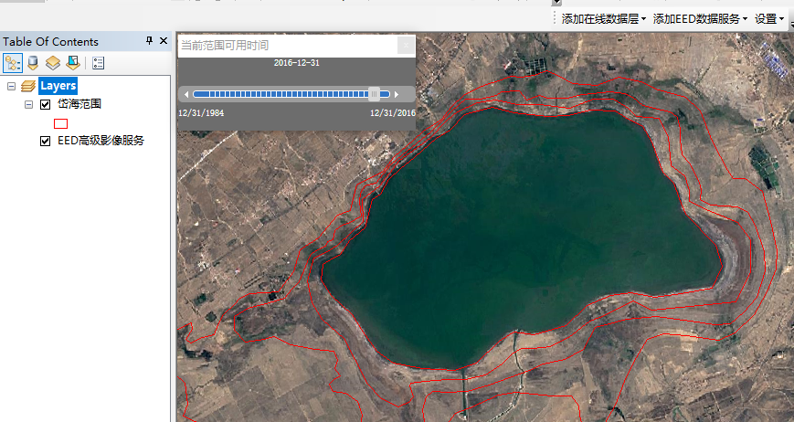 在arcMap影像加载插件中加载 “EED高级影像服务”图层,将视图移动到有多个时间点数据的位置,时间轴控件自动显示当前范围的可用时间,