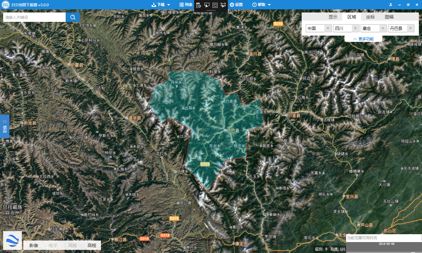 2.1.1 首先下载整个区域的谷歌地球影像文件或者是历史影像文件。示例选用四川省康定市丹巴县
