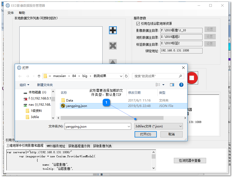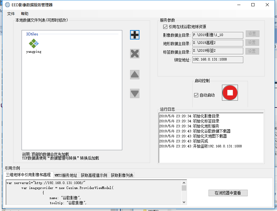 1.3 以在线或者离线方式启动数据服务程序,在本地数据中添加上面得到两个EED影像数据库文件,打开三维浏览地址,即能看到三维效果。