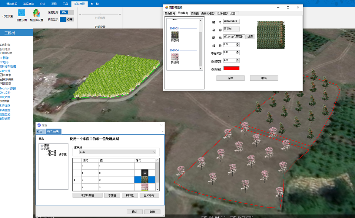 3根据shp面轮廓,使用各类景观树填充。