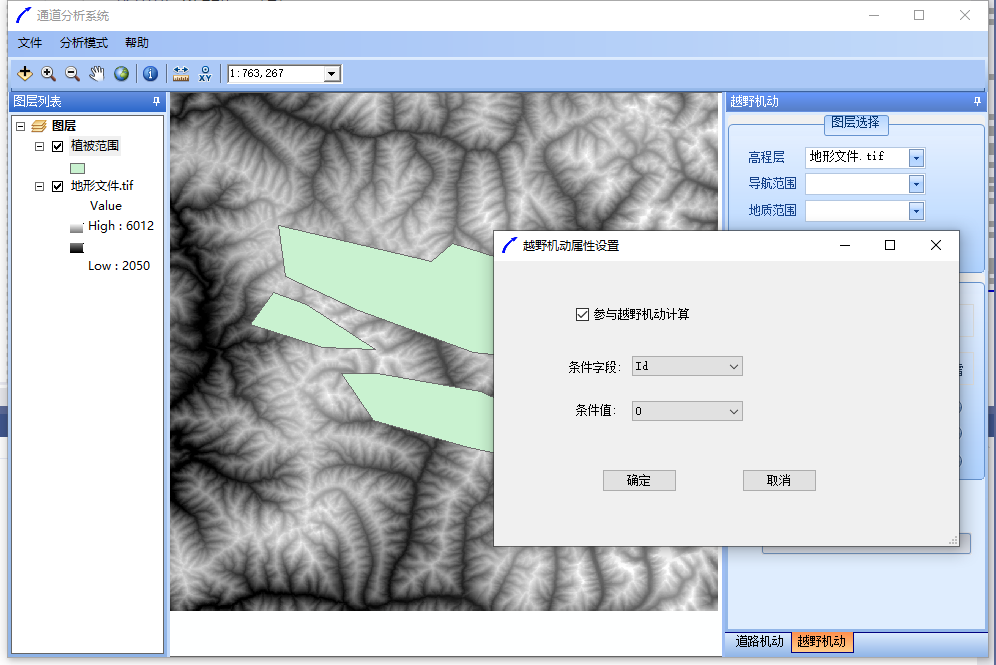 越野机动时可能需要多个图层,在添加面状要素图层后,右键该 图层,在弹出的菜单里选择越野机动设置,即可弹出设置对话框,在对话框中,设定该图层是否参与运算,以及字段选择。
